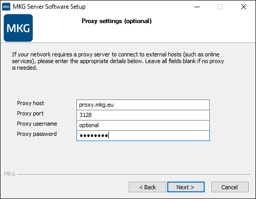 Tijdens de installatie van MKG kan in de installatiewizard, onder het onderdeel ‘Proxy settings’, de benodigde configuratie voor proxyondersteuning worden opgegeven. Indien deze instellingen worden ingevuld, zal de installatie zelf ook gebruikmaken van de proxyserver voor uitgaande connecties.